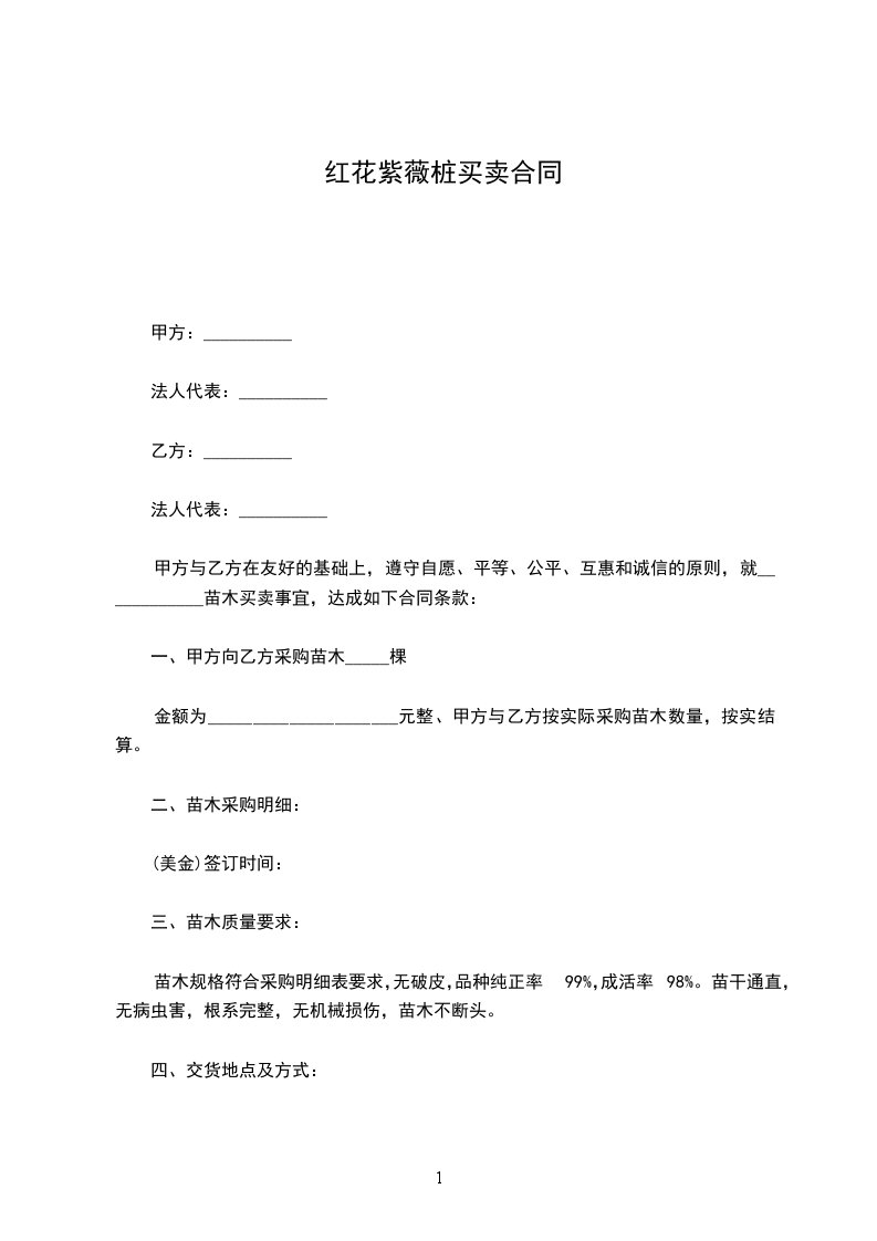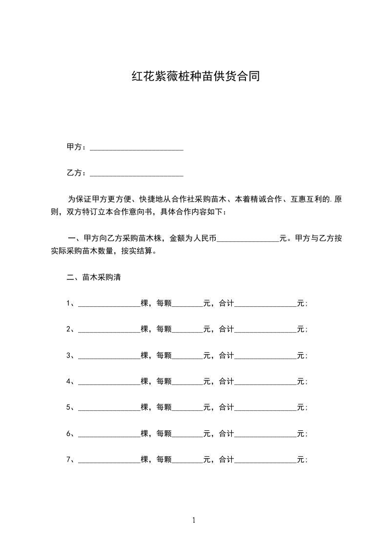 一、甲方向乙方采购苗木株,金额为人民币________________元。甲方与乙方按实际采购苗木数量,按实结算。