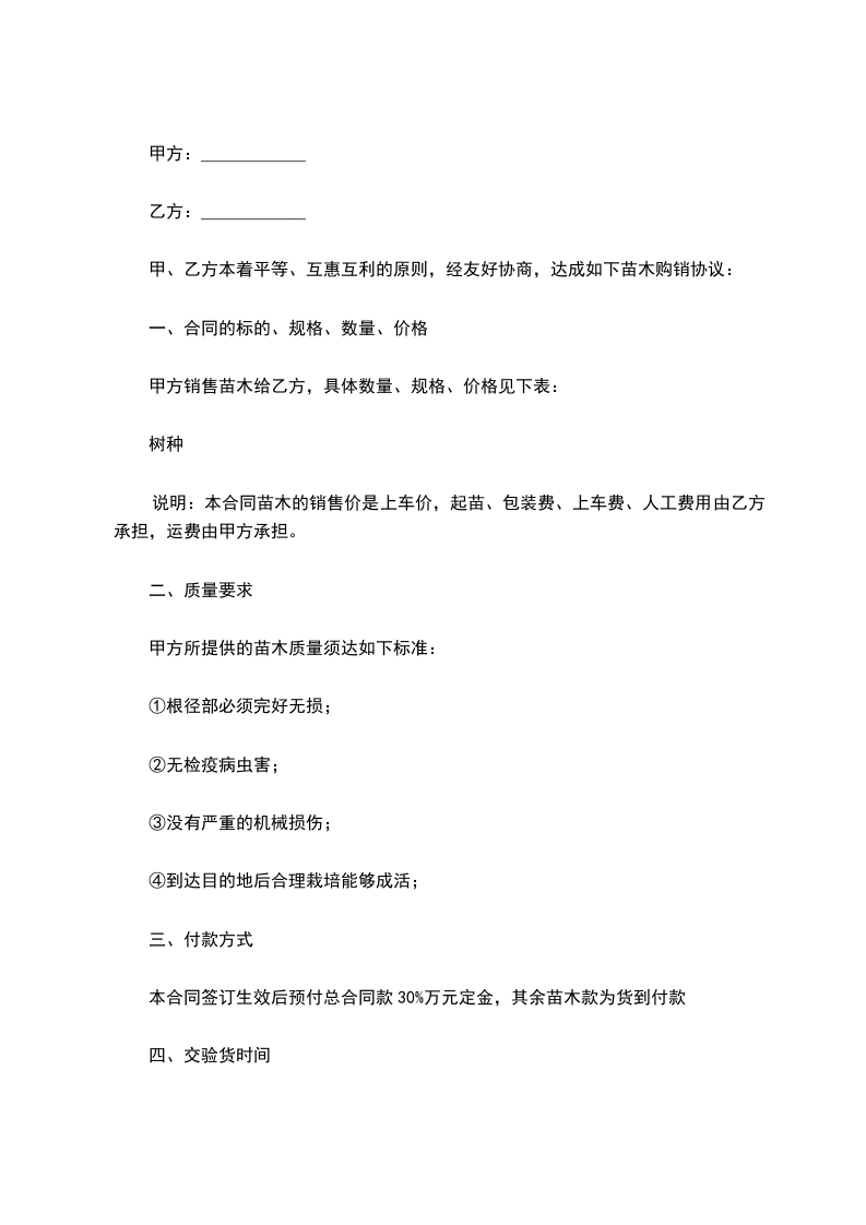 一、甲方向乙方采购苗木_______株,金额为人民币________.甲方与乙方按实际采购苗木数量,按实结算。