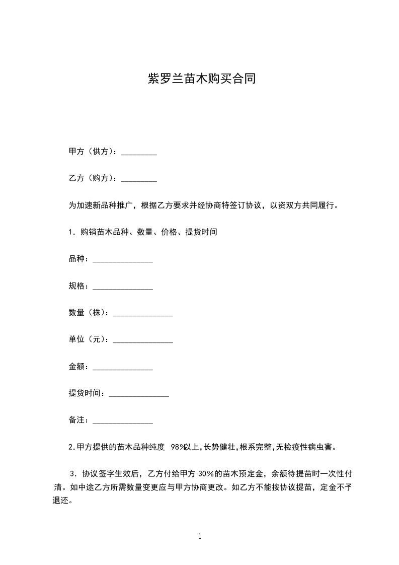3.协议签字生效后,乙方付给甲方30%的苗木预定金,余额待提苗时一次性付清。如中途乙方所需数量变更应与甲方协商更改。如乙方不能按协议提苗,定金不予退还。