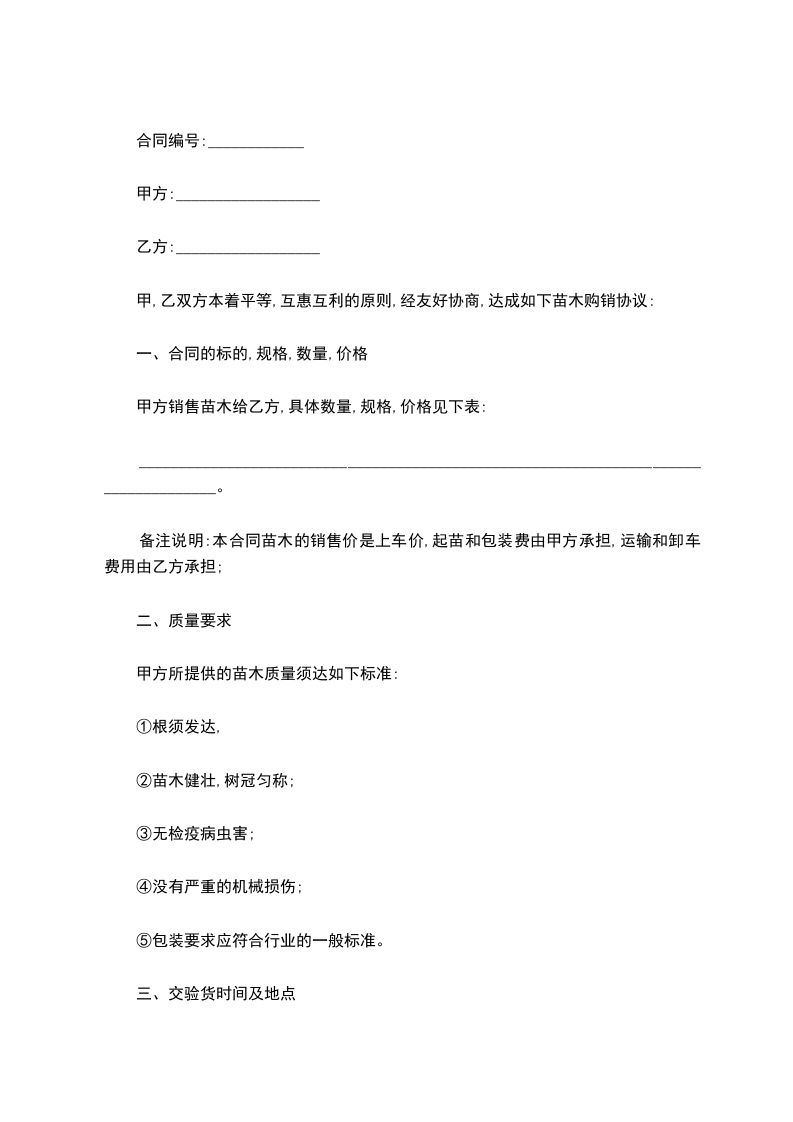 (1)如期、如质、如量按合同第二条第二款附表中的数量选苗、起挖、包扎、吊装及运输至甲方地点。