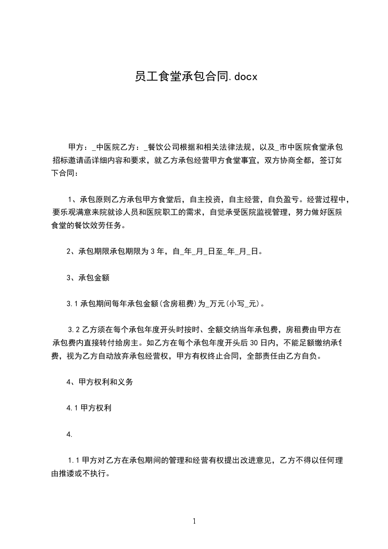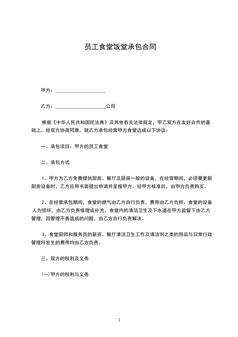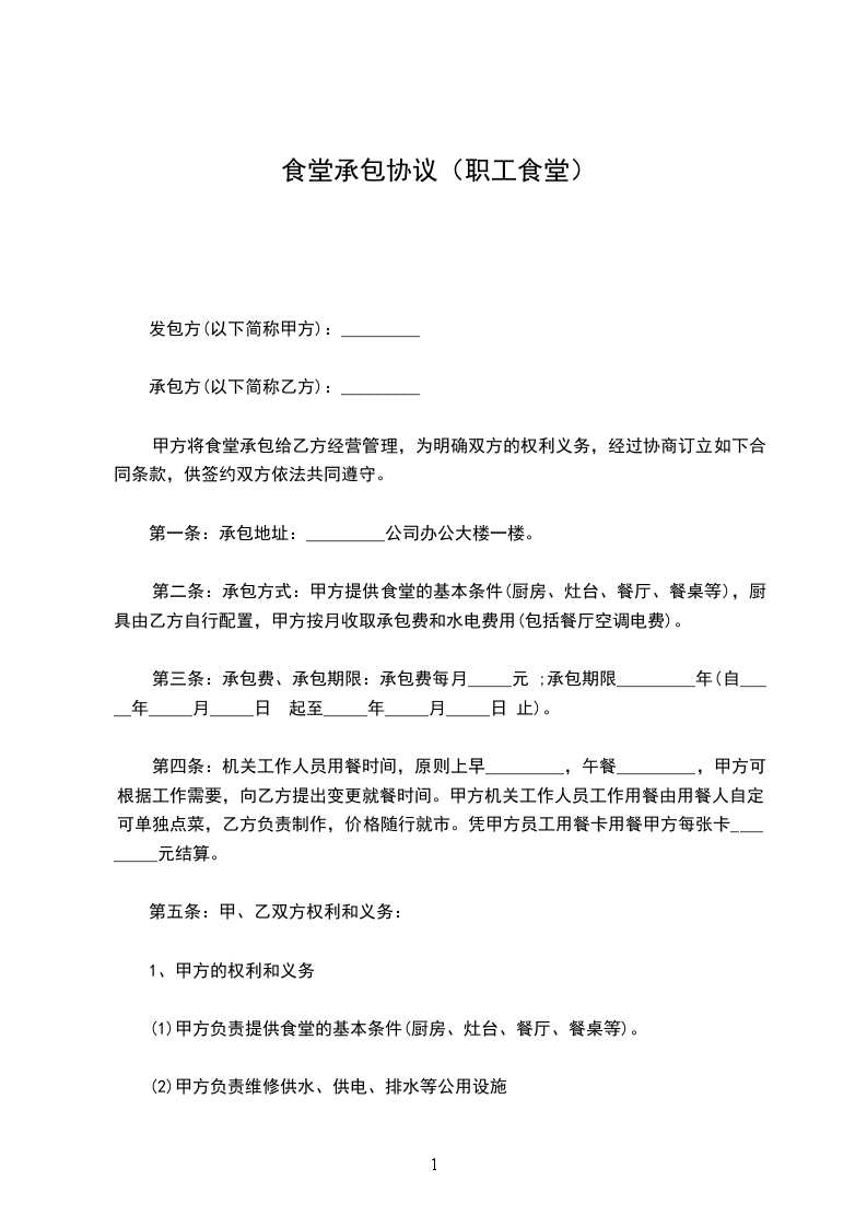 为了搞好职工生活,提高饭菜质量,增加花色品种,转变工作态度,更好的为职工服务,甲方将食堂推向市场承包给个体经营,为明确双方的权利和义务,经过甲乙双方友好协商,特订立本合同。
