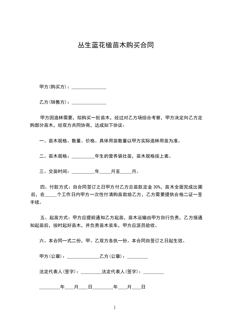 四、付款方式:自合同签订之日甲方付乙方总苗款定金30%,苗木全面完成出圃后,在_____个工作日内甲方一次性付清购苗款给乙方,乙方需要提供合格二证一签手续。