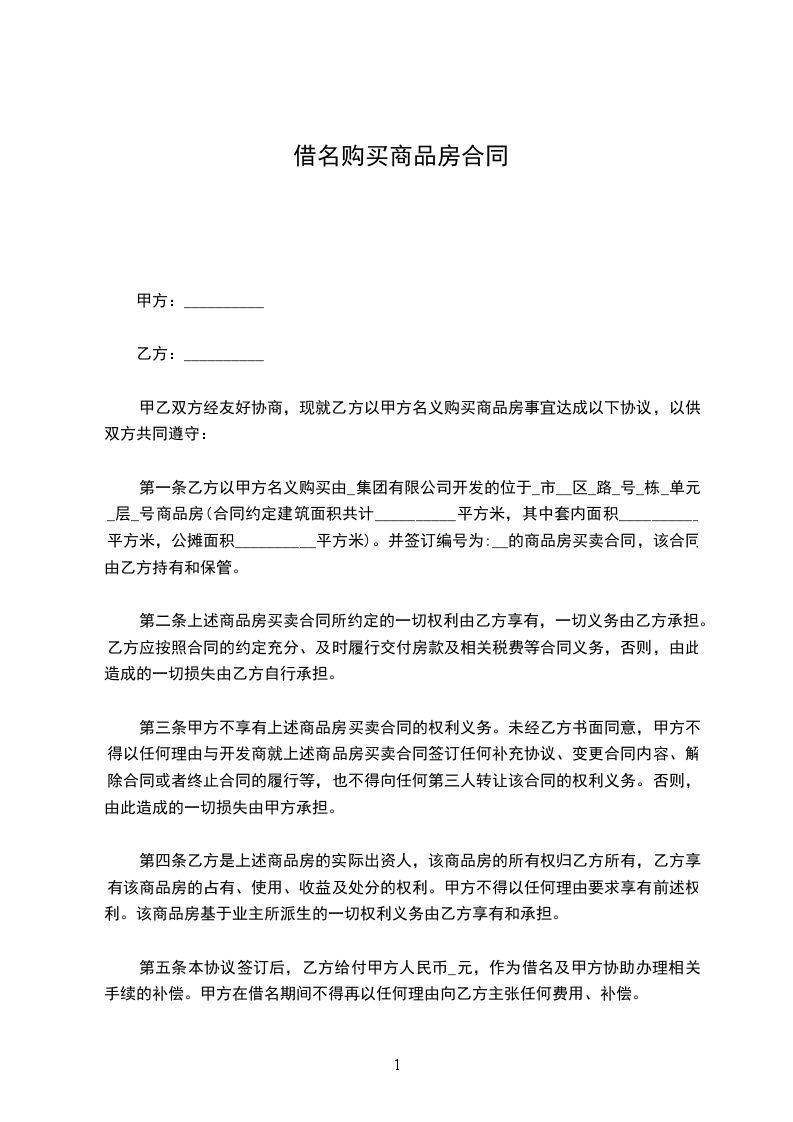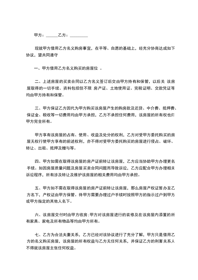 第二条 甲方只需以自己名义与开发商签订商品房买卖合同并准许乙方借用自己名义缴纳各种税费、办理相关手续,甲方无需承担任何法律上和经济上的风险。因购买该处房产产生的所有费用及所有法律风险均由乙方承担。