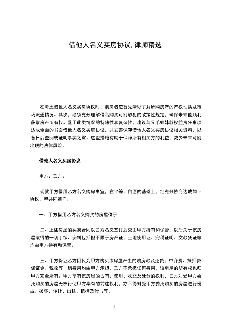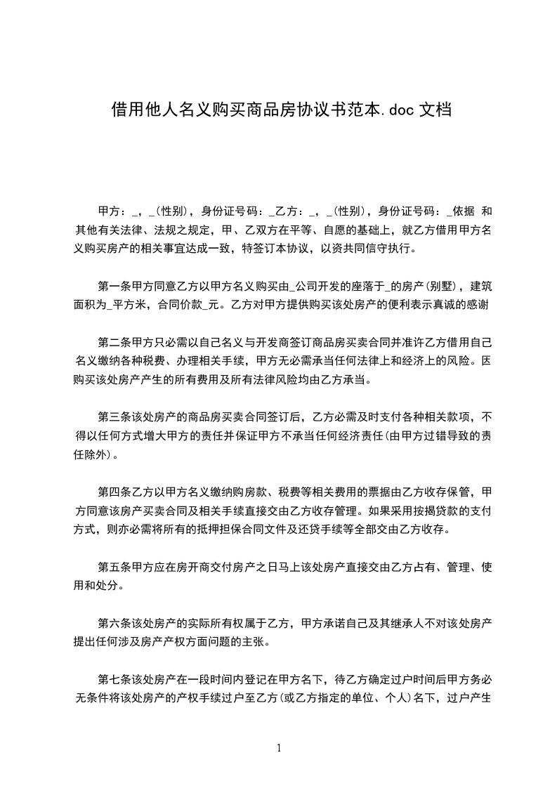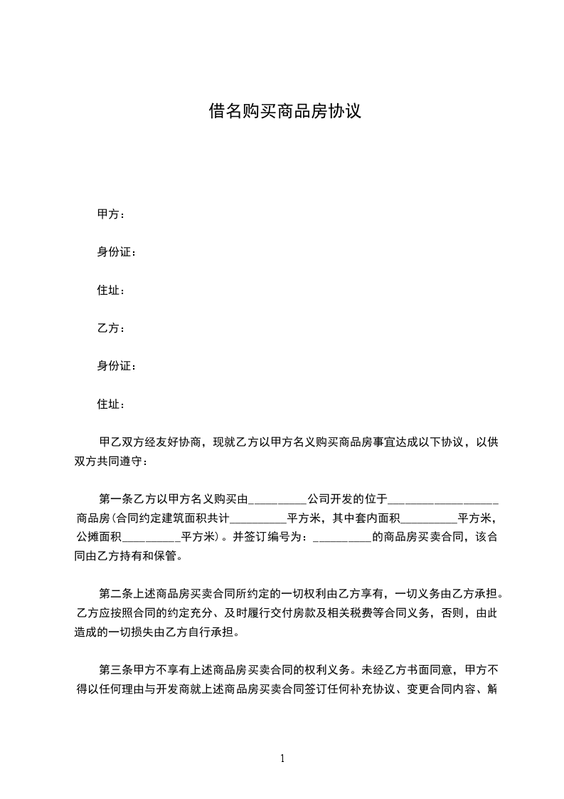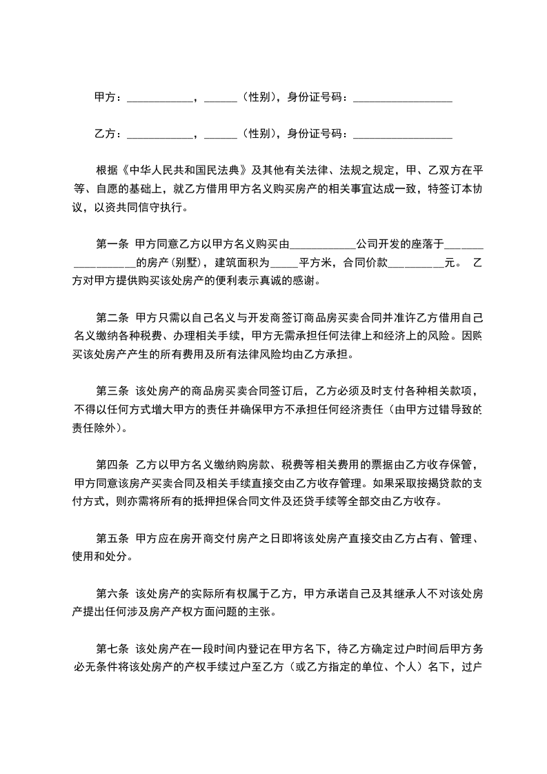 根据《中华人民共和国民法典》及其他有关法律、法规之规定,甲、乙双方在平等、自愿的基础上,就乙方借用甲方名义购买房产的相关事宜达成一致,特签订本协议,以资共同信守执行。