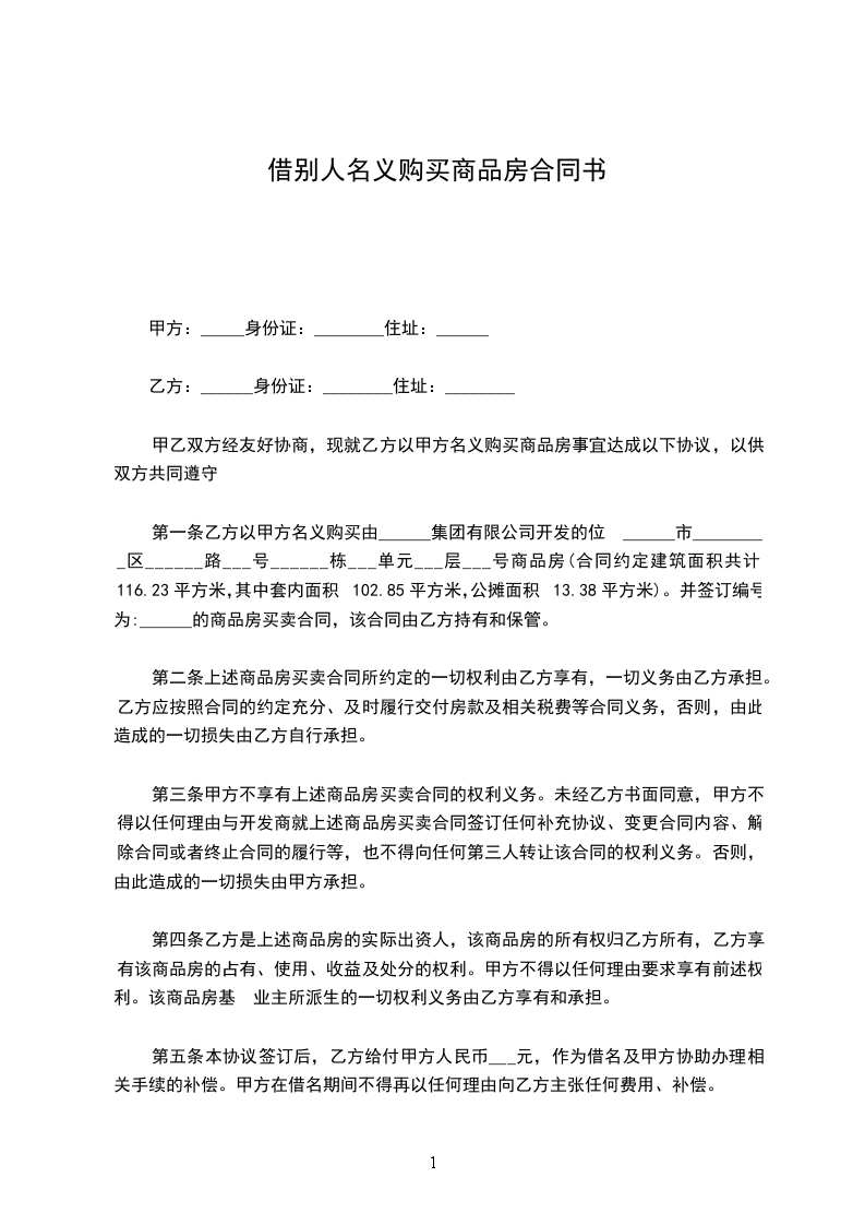 第一条 甲方同意乙方以甲方名义购买由____________公司开发的座落于__________________的房产(别墅),建筑面积为_____平方米,合同价款__________元。 乙方对甲方提供购买该处房产的便利表示真诚的感谢。