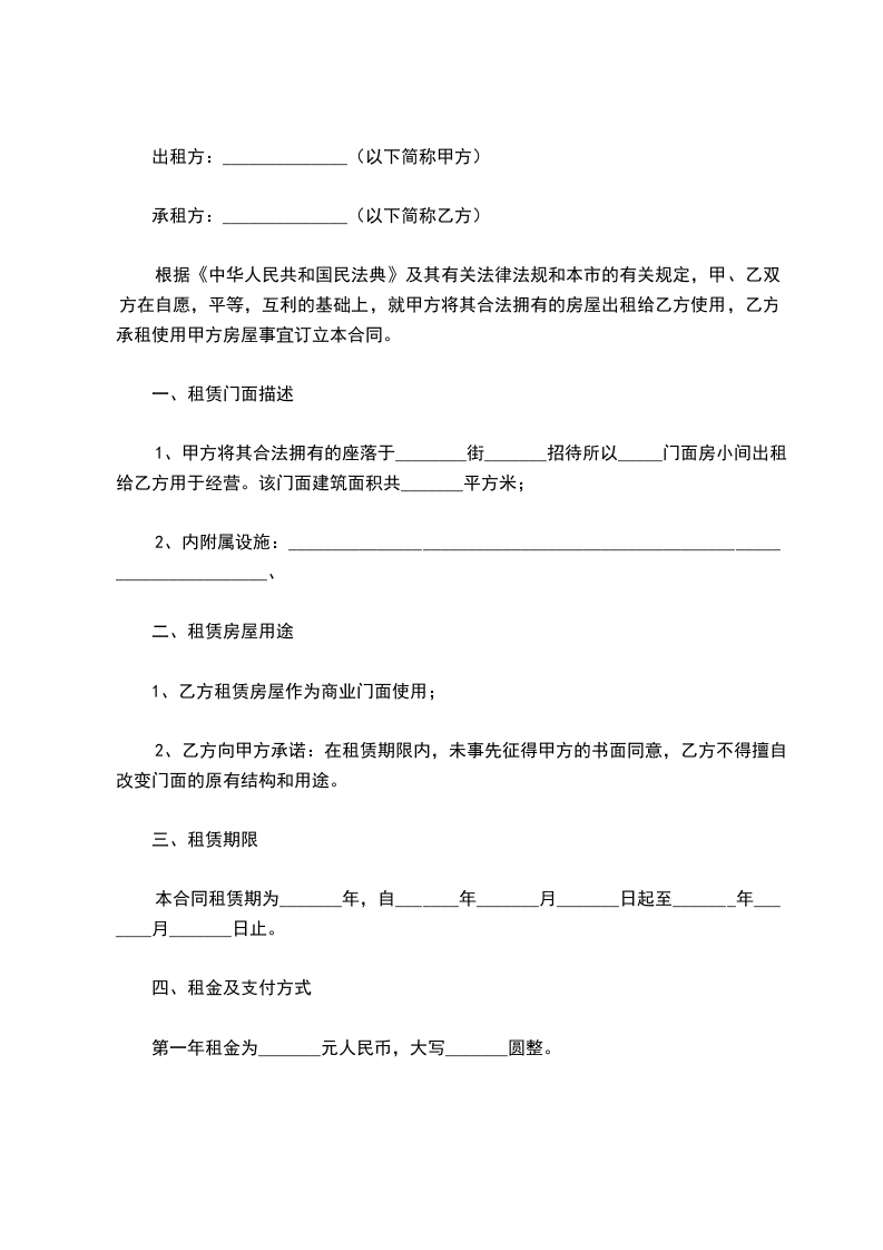 1、甲方将其合法拥有的座落于________街_______招待所以_____门面房小间出租给乙方用于经营。该门面建筑面积共_______平方米;