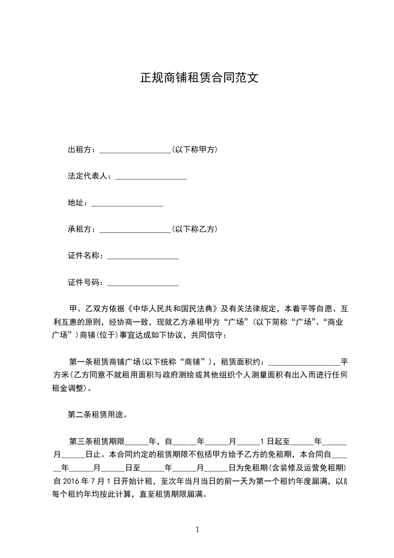 第一条租赁商铺广场(以下统称“商铺”),租赁面积约:__________________平方米(乙方同意不就租用面积与政府测绘或其他组织个人测量面积有出入而进行任何租金调整)。