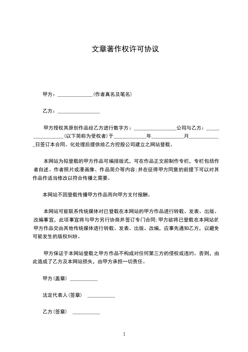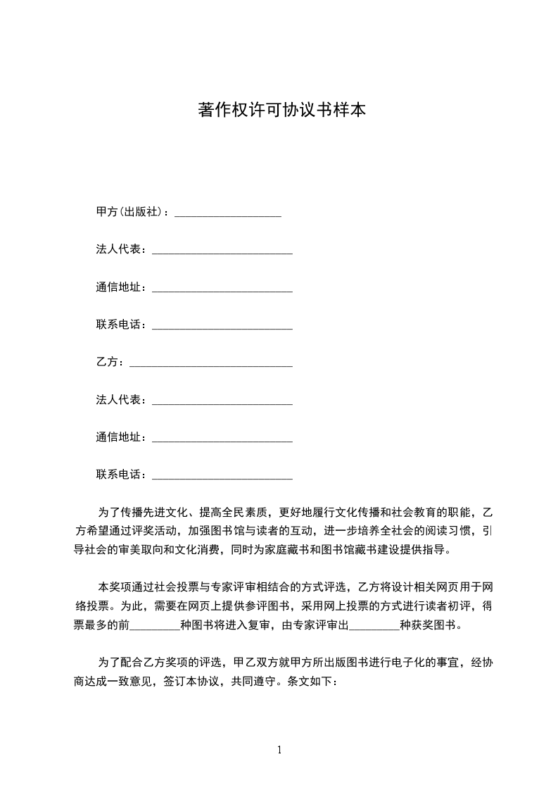 1.甲方同意向乙方无偿非专属授权使用书名为_________的著作(包括该著作的版式及装帧,以下简称本著作)