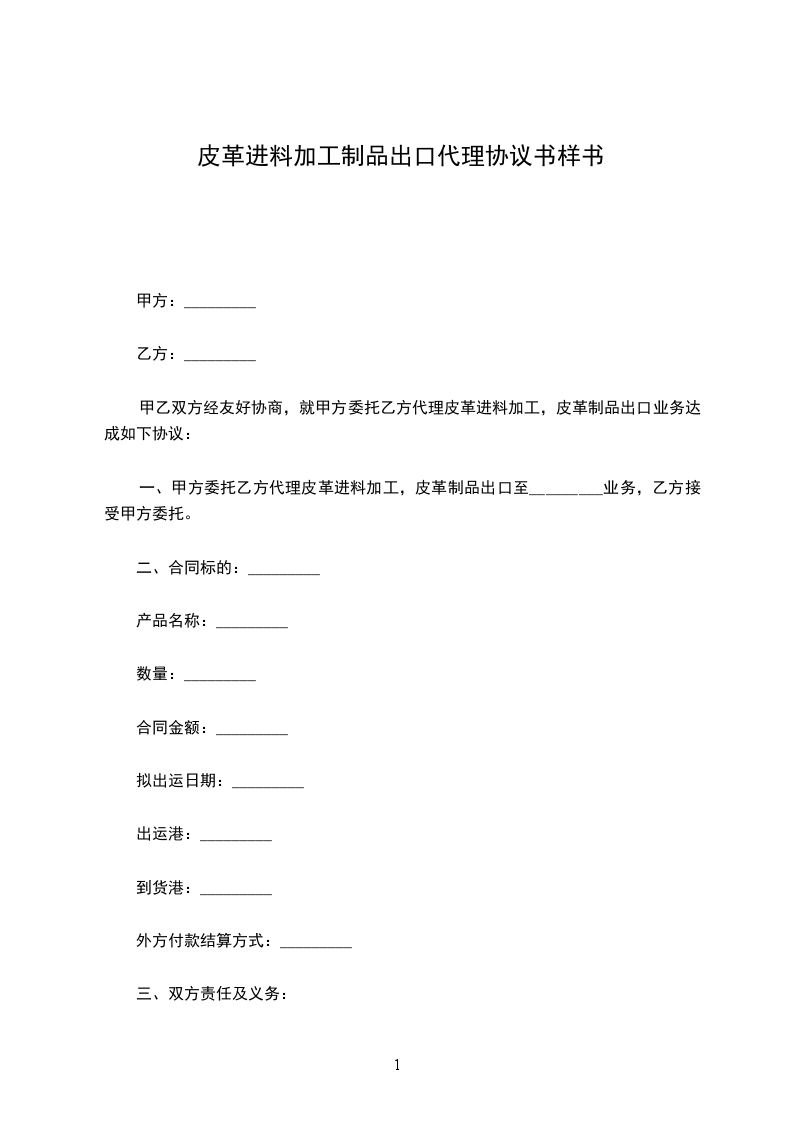 一、甲方委托乙方代理皮革进料加工,皮革制品出口至_________业务,乙方接受甲方委托。