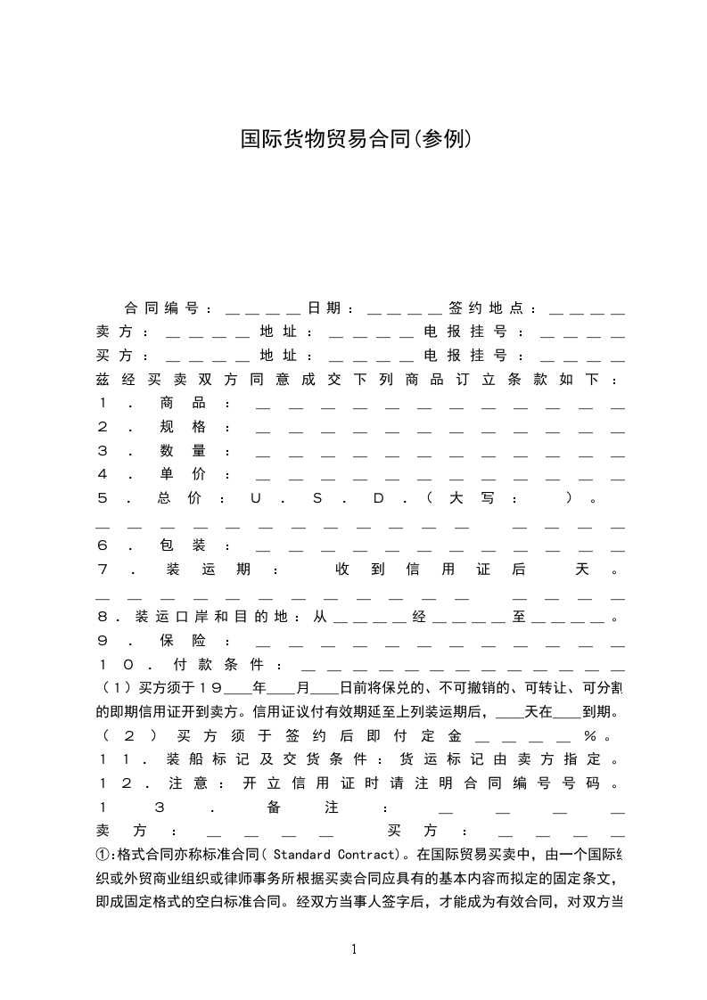 ①:格式合同亦称标准合同(Standard Contract)。在国际贸易买卖中,由一个国际组织或外贸商业组织或律师事务所根据买卖合同应具有的基本内容而拟定的固定条文,即成固定格式的空白标准合同。经双方当事人签字后,才能成为有效合同,对双方当事人都有法律的约束力。____________