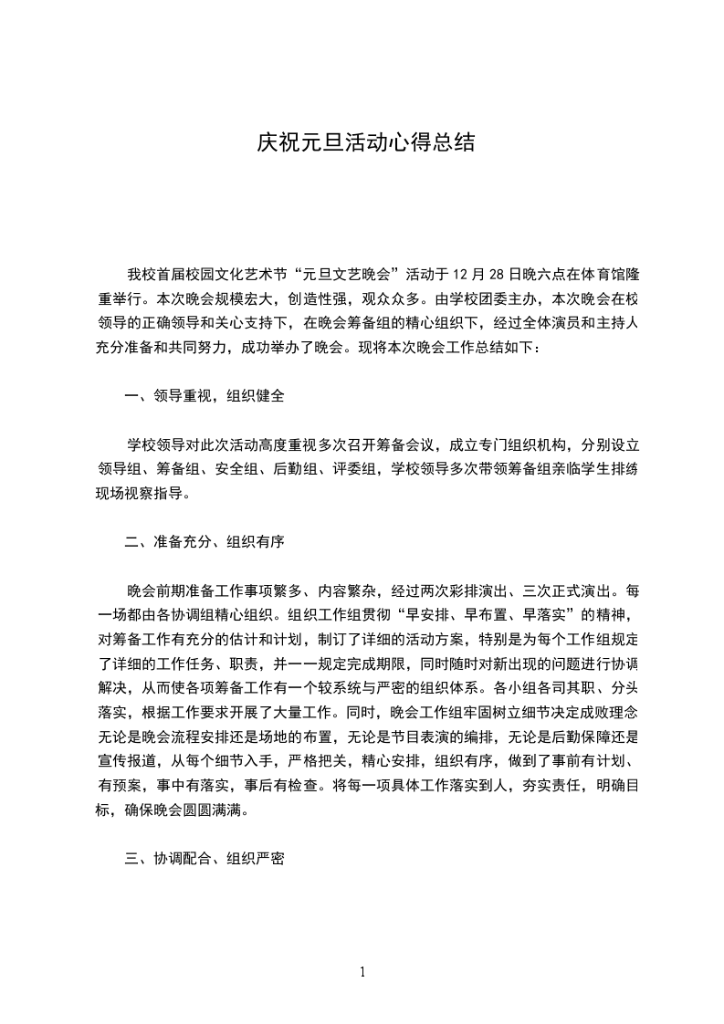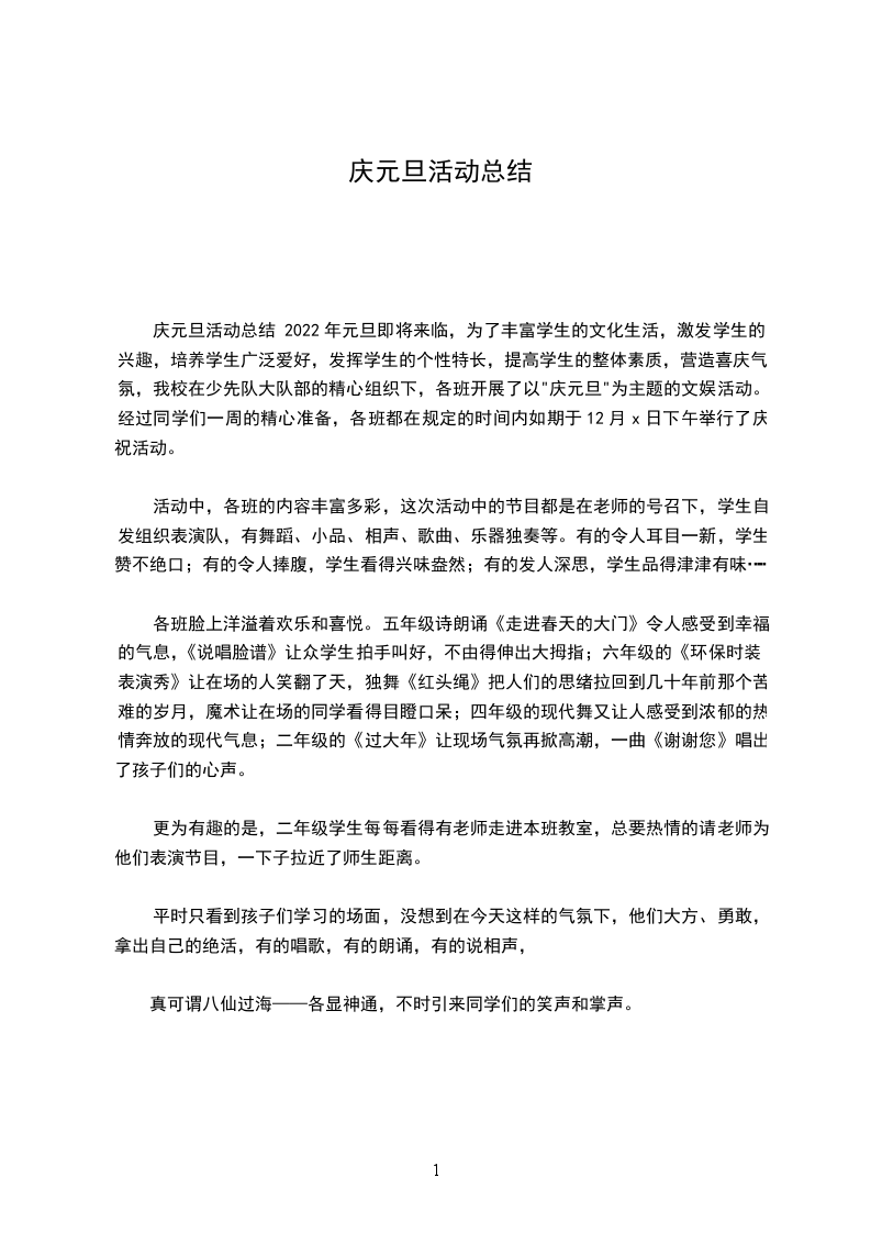 庆元旦活动总结 2024年元旦即将来临,为了丰富学生的文化生活,激发学生的兴趣,培养学生广泛爱好,发挥学生的个性特长,提高学生的整体素质,营造喜庆气氛,我校在少先队大队部的精心组织下,各班开展了以"庆元旦"为主题的文娱活动。经过同学们一周的精心准备,各班都在规定的时间内如期于12月x日下午举行了庆祝活动。