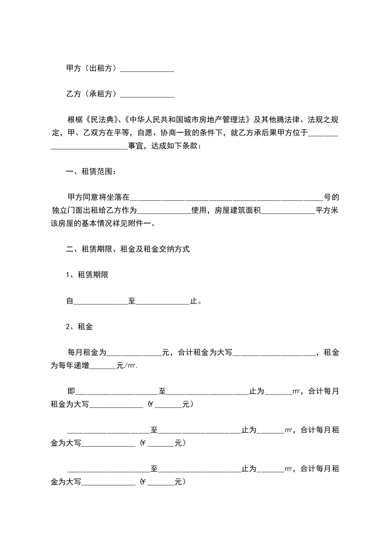 甲方同意将坐落在_________________________________________________号的独立门面出租给乙方作为______________使用,房屋建筑面积______________平方米,该房屋的基本情况祥见附件一。