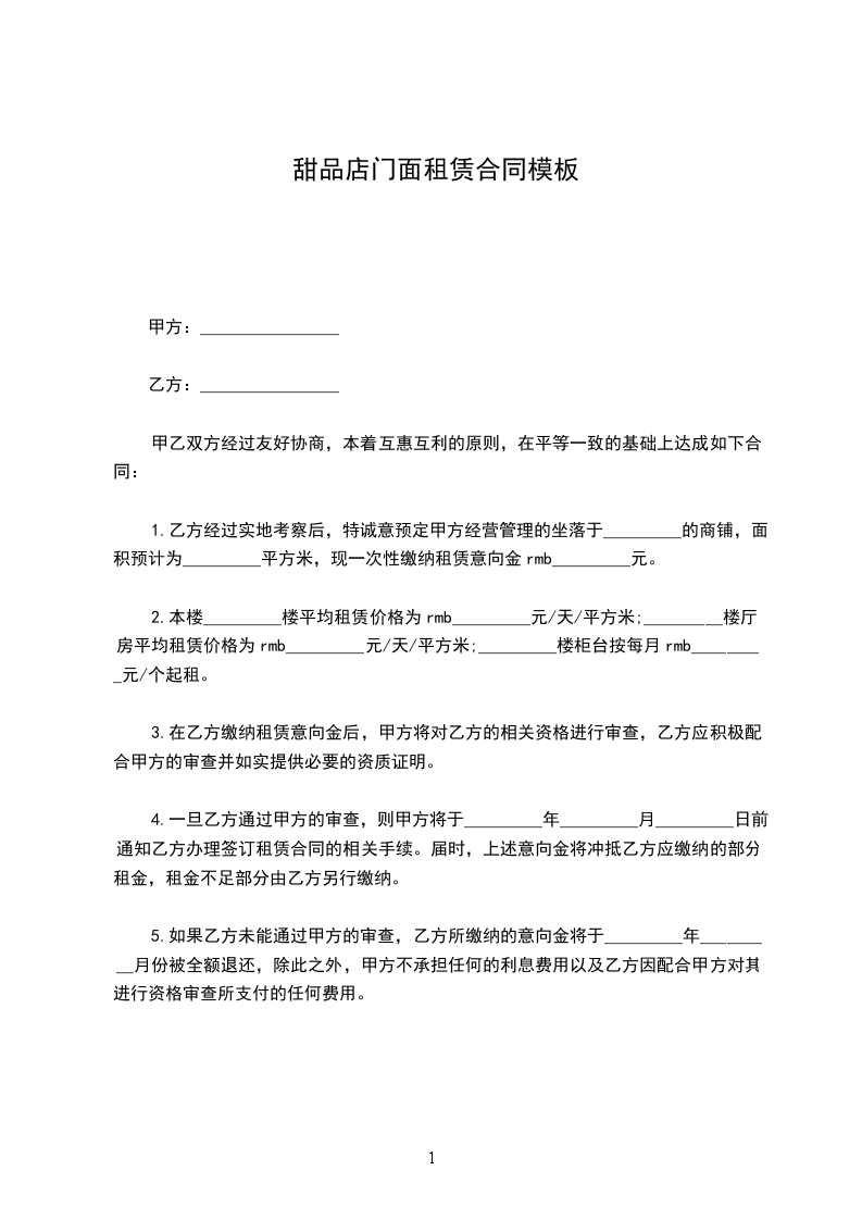 1.乙方经过实地考察后,特诚意预定甲方经营管理的坐落于_________的商铺,面积预计为_________平方米,现一次性缴纳租赁意向金rmb_________元。