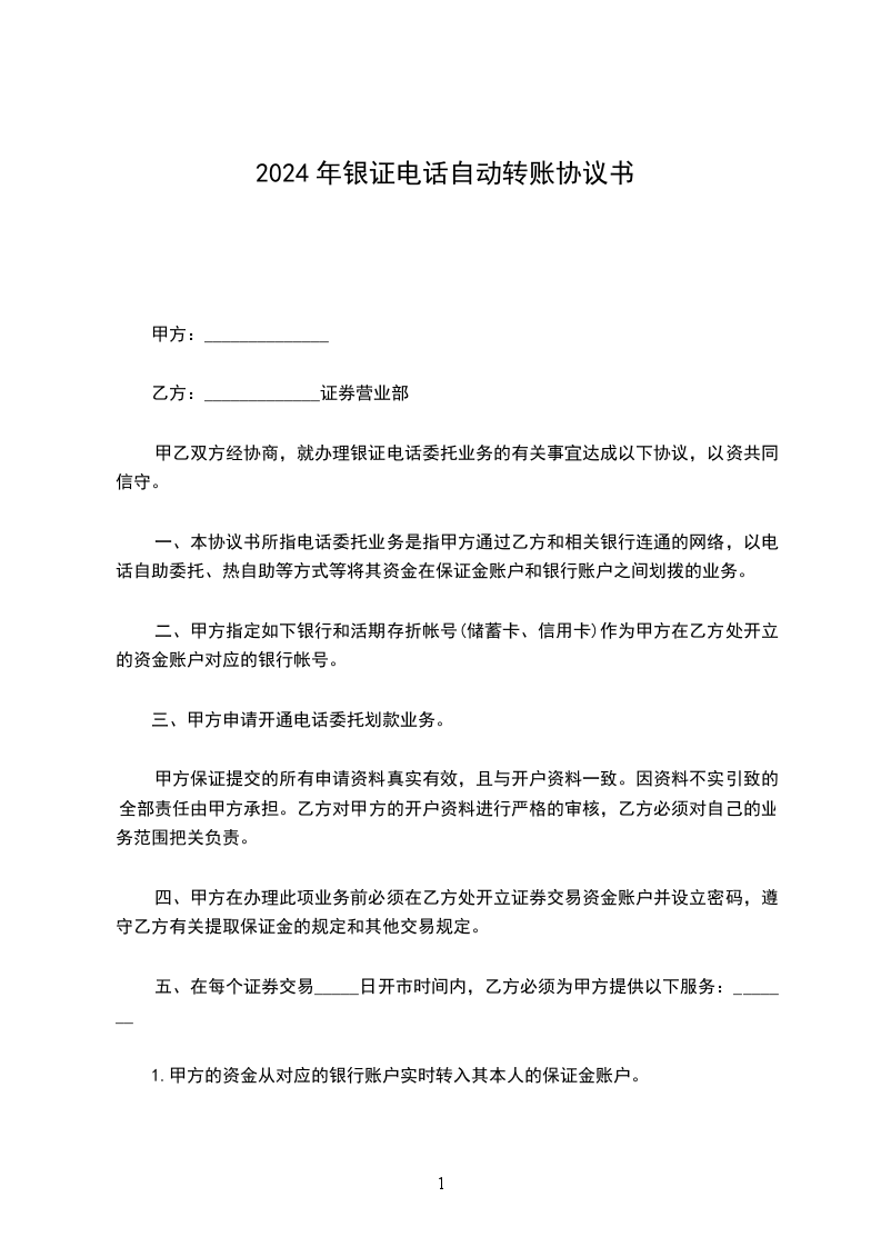 一、本协议书所指电话委托转帐业务是指甲方通过乙方和相关银行连通的网络,以电话自助委托、热自助等方式等将其资金在保证金账户和银行账户之间划拨转帐的业务。