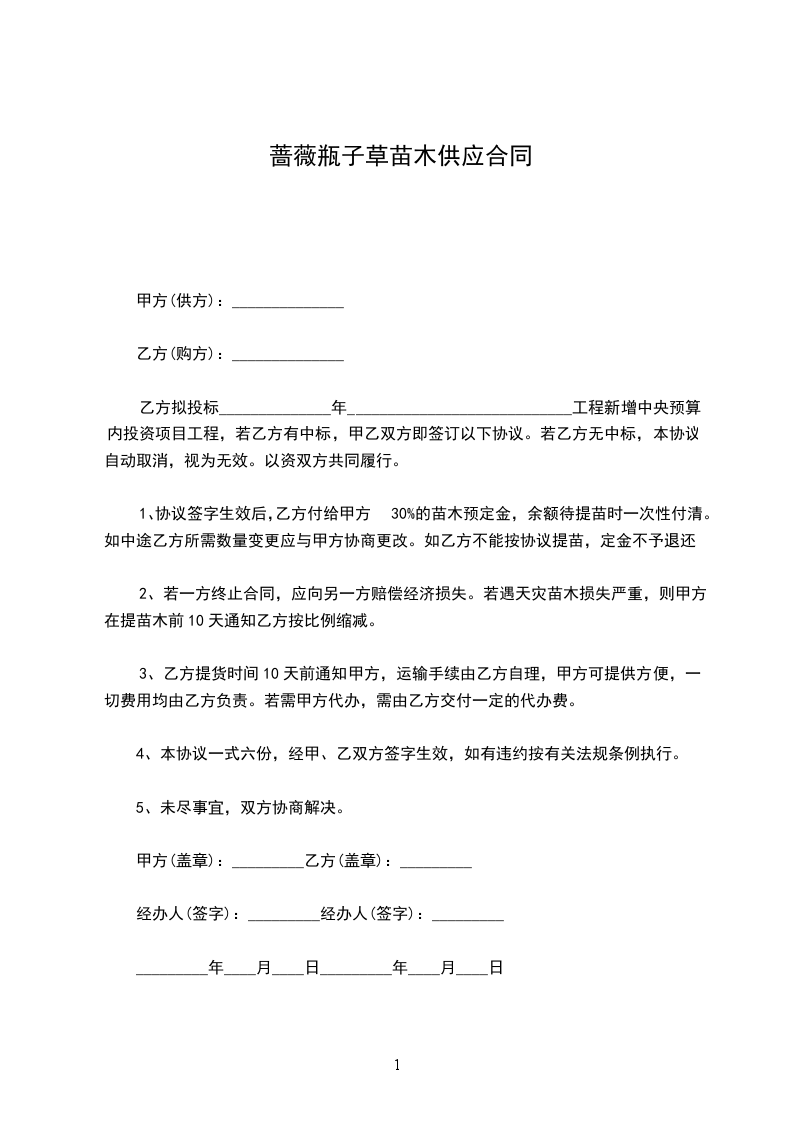 1、协议签字生效后,乙方付给甲方30%的苗木预定金,余额待提苗时一次性付清。如中途乙方所需数量变更应与甲方协商更改。如乙方不能按协议提苗,定金不予退还。