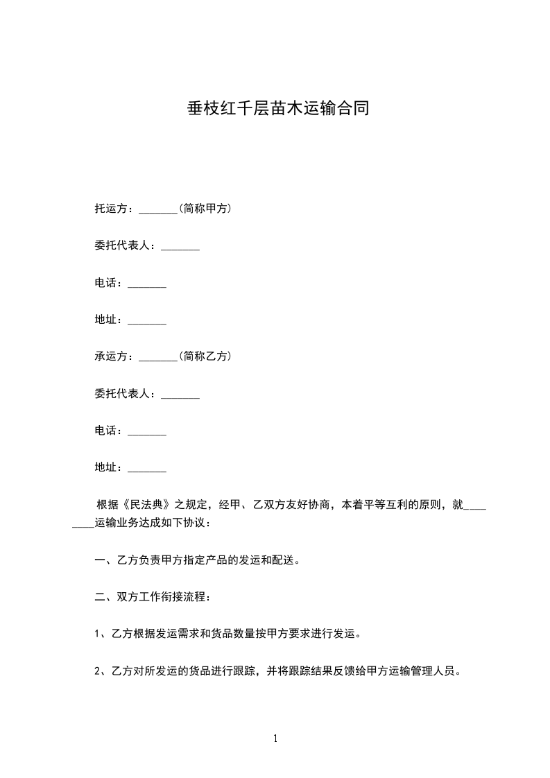 一、根据乙方的需要,甲方组织保质保量的货源,由乙方在场地内自由选购发育正常的树苗,达到乙方满意。乙方购买______________(______________)株,______________(______________)株。(_____________________每株______________元,______________每株______________元)树苗共计_____________________元整。