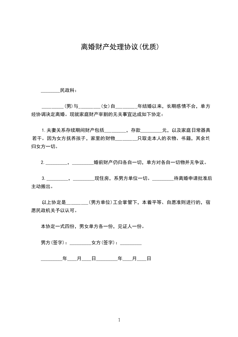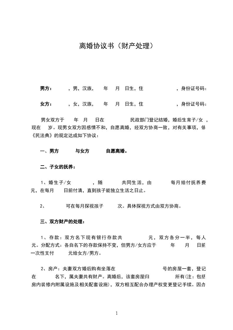 1、存款:双方名下现有银行存款共 元,双方各分一半,每人 元。分配方式:各自名下的存款保持不变,但男方/女方应于 年 月 日前一次性支付 元给女方/男方。