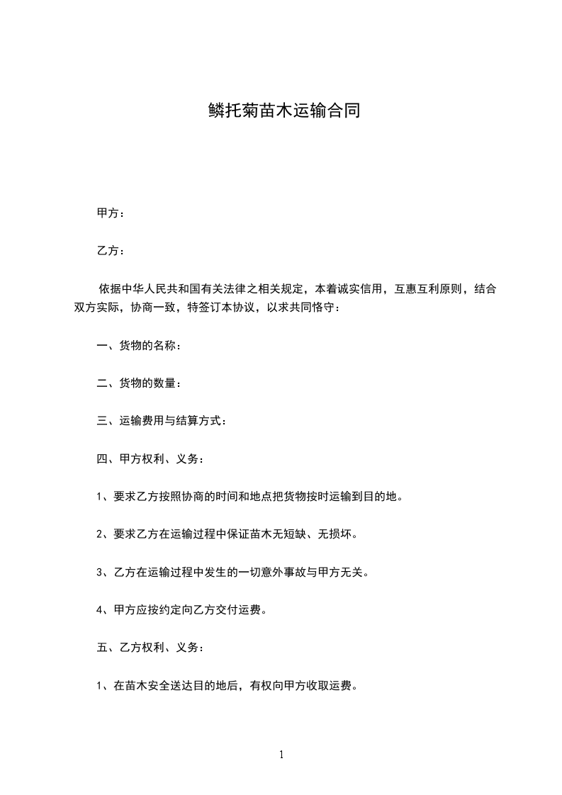 一、甲方向乙方采购苗木株,金额为人民币____________元。甲方与乙方按实际采购苗木数量,按实结算。