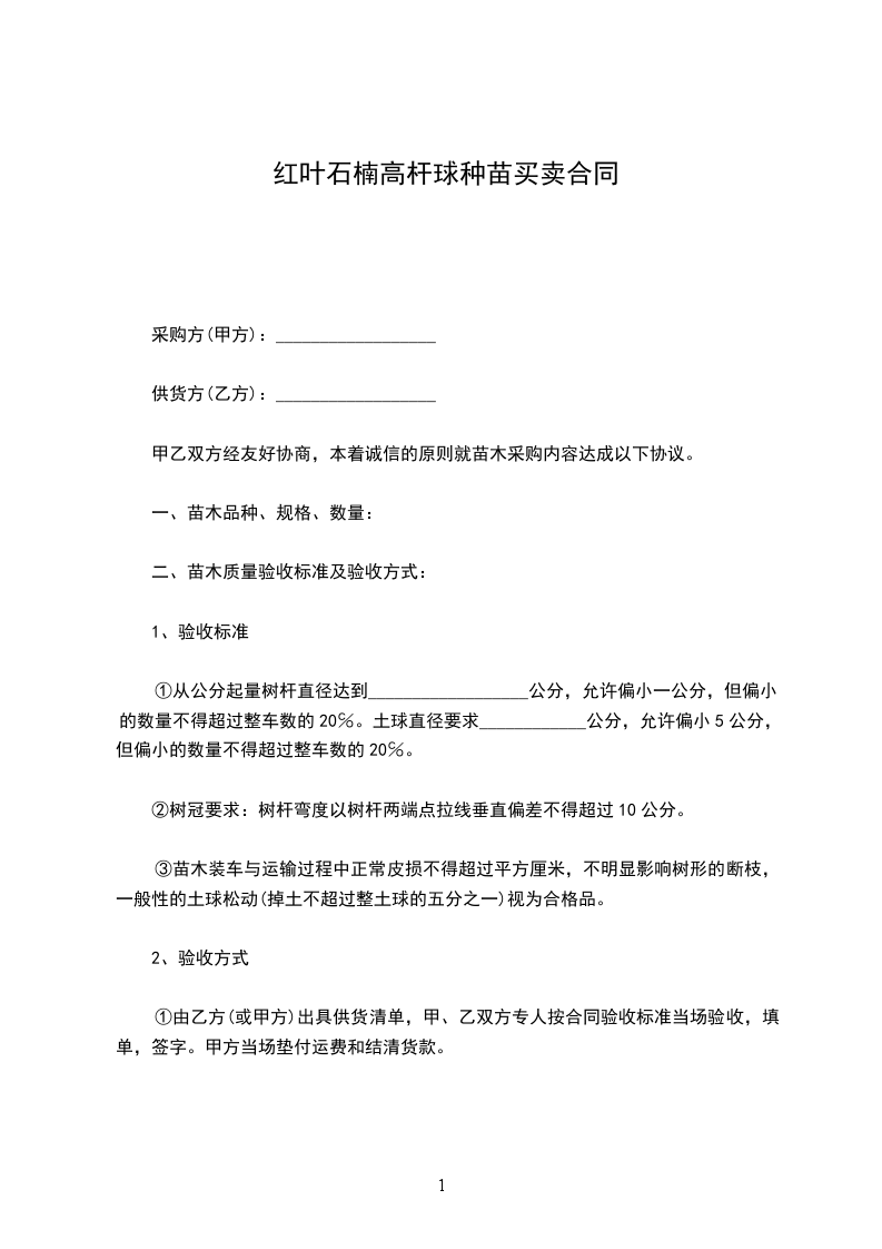 一、根据乙方的需要,甲方组织保质保量的货源,由乙方在场地内自由选购发育正常的树苗,达到乙方满意。乙方购买______________(______________)株,______________(______________)株。(_____________________每株______________元,______________每株______________元)树苗共计_____________________元整。