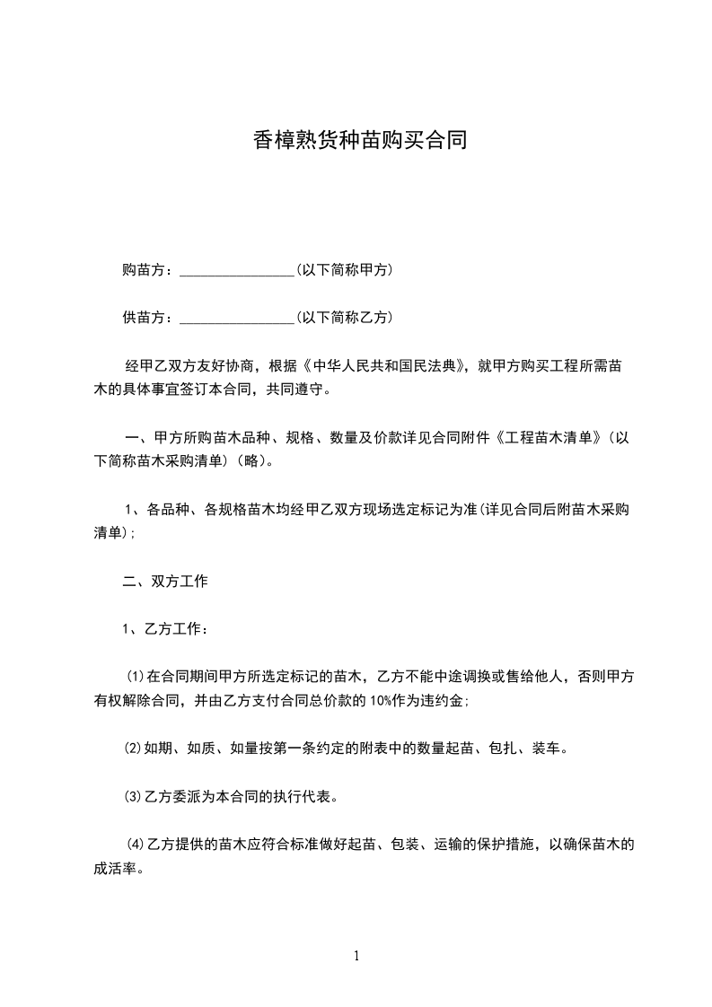 经甲乙双方友好协商,根据《中华人民共和国民法典》,就甲方购买工程所需苗木的具体事宜签订本合同,共同遵守。