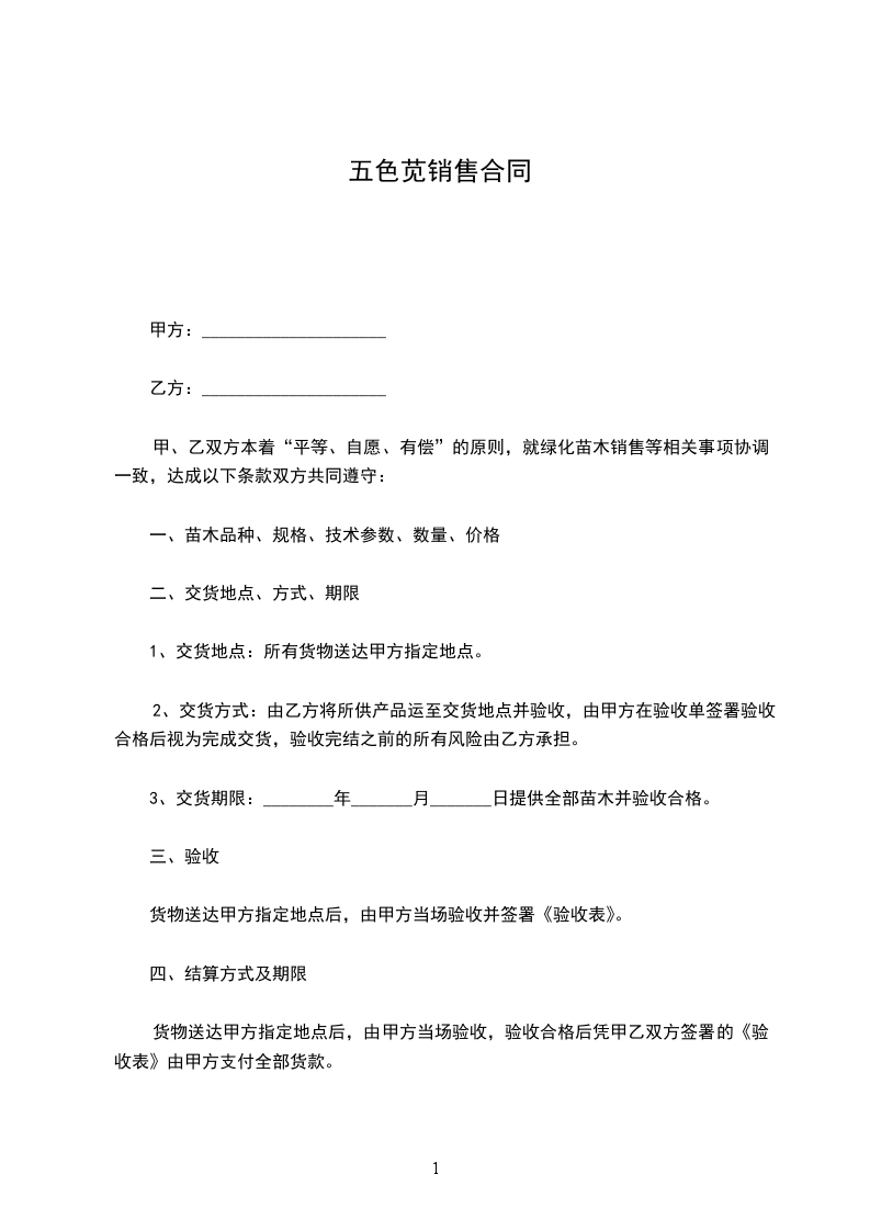 一、甲方向乙方采购苗木,具体的苗木品种、规格、单价等见本合同附件(苗木采购确认表)所列内容。本合同总价为人民币______________元。如遇甲方场地受限等原因不能全部种植,经双方协商,乙方需按甲方实际需要苗木数量进行供苗,按实结算;多出部分甲方有权不予接收或退还,由乙方自行处理。