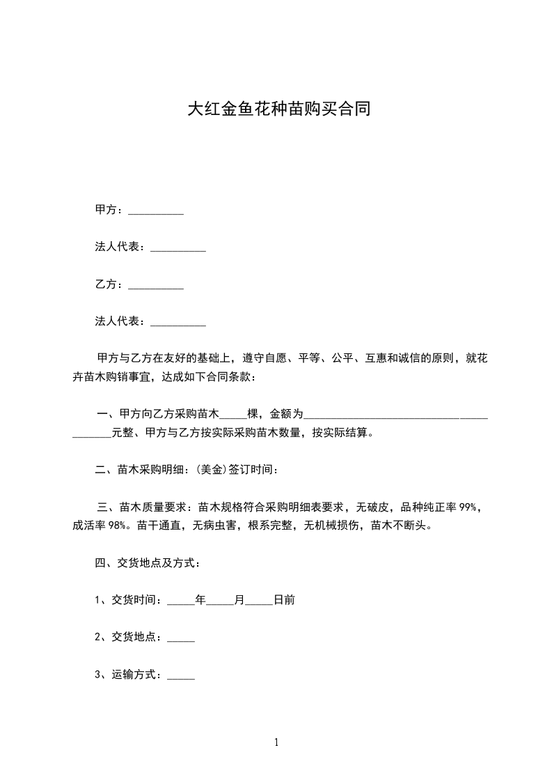 一、甲方向乙方采购苗木,具体的苗木品种、规格、单价等见本合同附件(苗木采购确认表)所列内容。本合同总价为人民币______________元。如遇甲方场地受限等原因不能全部种植,经双方协商,乙方需按甲方实际需要苗木数量进行供苗,按实结算;多出部分甲方有权不予接收或退还,由乙方自行处理。