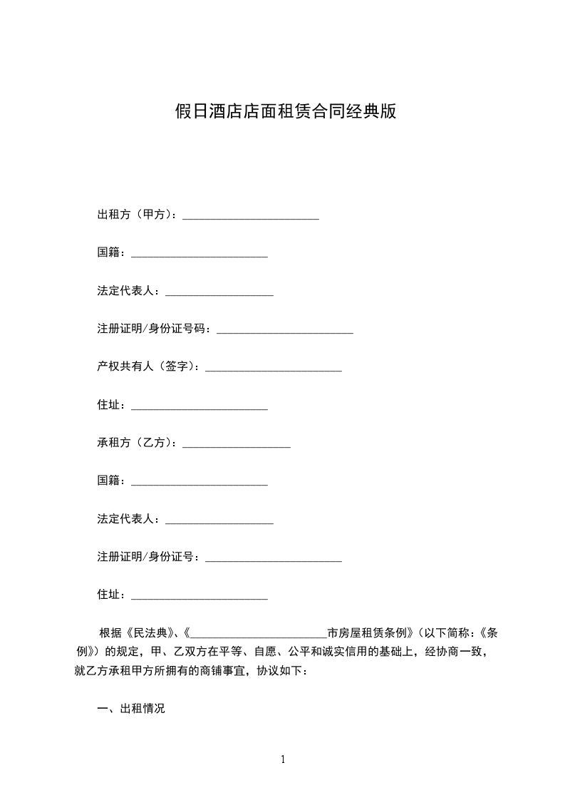 一、甲方将位于____________________号门面租赁给乙方。甲方对所出租的房屋具有合法产权。