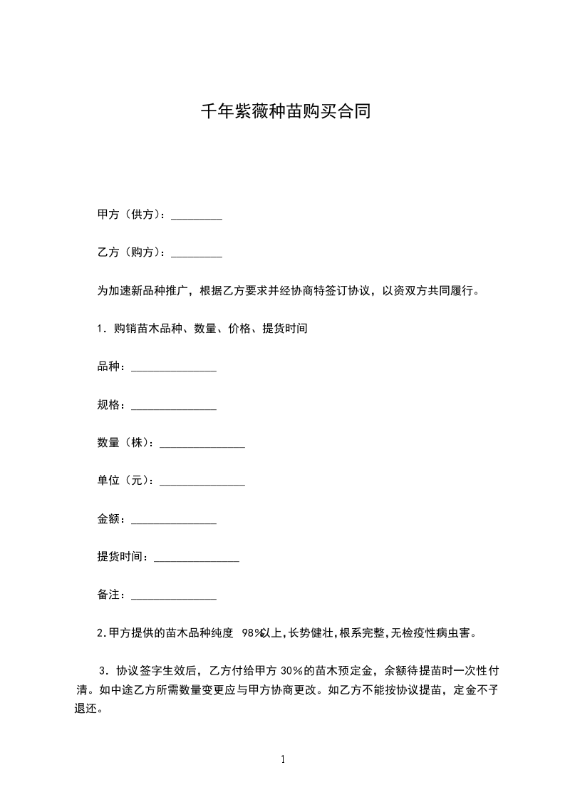 3.协议签字生效后,乙方付给甲方30%的苗木预定金,余额待提苗时一次性付清。如中途乙方所需数量变更应与甲方协商更改。如乙方不能按协议提苗,定金不予退还。