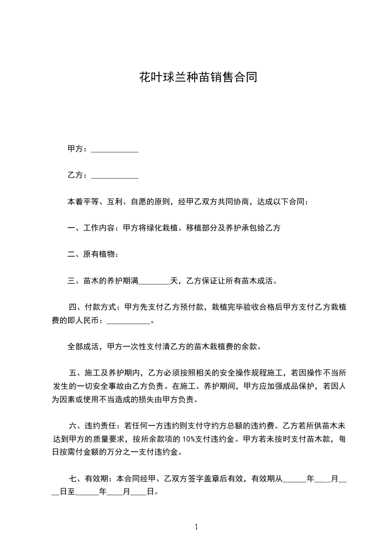 4、本合同为苗木买卖合同,乙方不承担甲方苗木成活率任何风险,但有为甲方提供技术指导的义务。5、合同有效期: