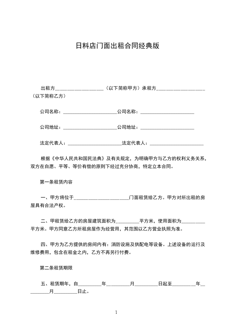 日料店门面出租合同模板