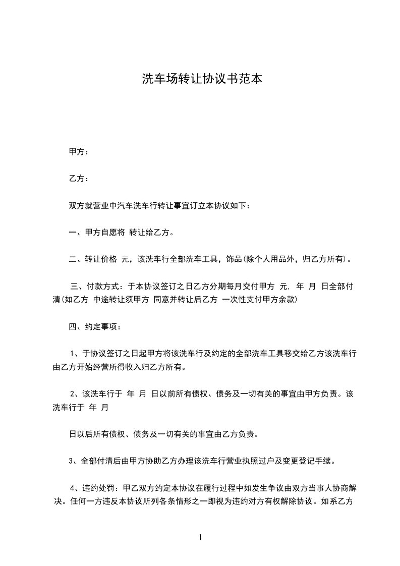 1、于协议签订之日起甲方将该洗车行及约定的全部洗车工具移交给乙方该洗车行由乙方开始经营所得收入归乙方所有。