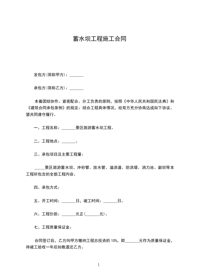 一、工程名称:_______景区旅游蓄水坝工程。