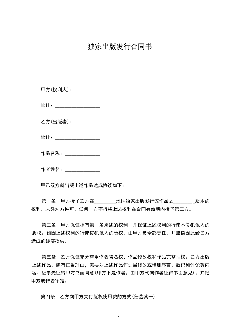 第一条 甲方授予乙方在_________地区独家出版发行该作品之_________版本的权利。未经对方许可,任何一方不得将上述权利在合同有效期内授予第三方。