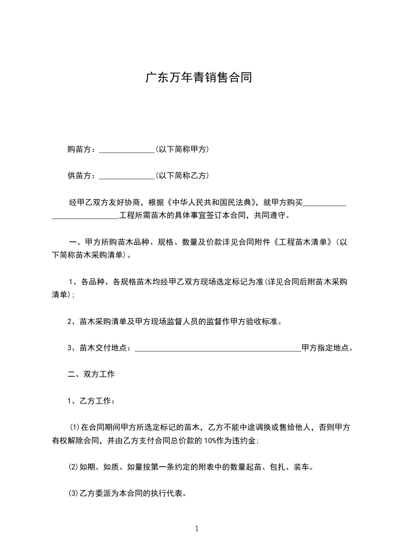 (1)在合同期间甲方所选定标记的苗木,乙方不能中途调换或售给他人,否则甲方有权解除合同,并由乙方支付合同总价款的10%作为违约金;
