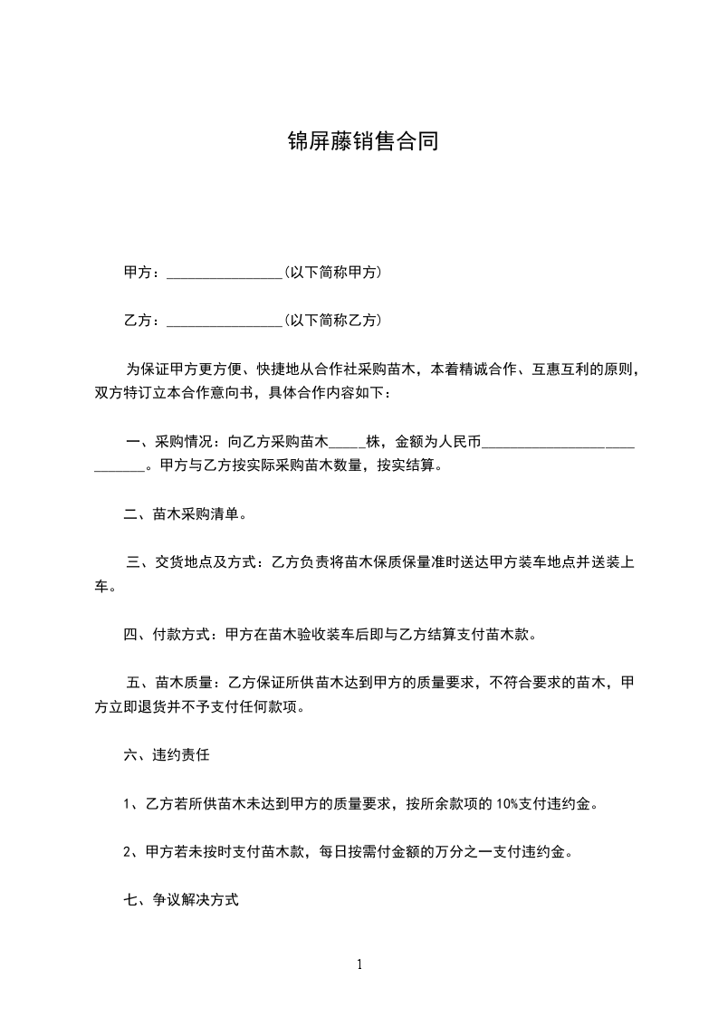 九、乙方违约责任:本合同的苗木质量保证金暂定交纳_____万元,苗木质量(规格、数量、包装、运输、质量)不符合规定,甲方有权退苗木。乙方负责在本合同约定的时间内向甲方提供数量相当的合格苗木,如乙方负责在本合同约定的时间内向甲方提供数量相当的合格苗木,如乙方未能按时向甲方提供本合同约定的合格苗木,则乙方应会给甲方苗木总价15%的违约金,本合同自运终止,甲有权另选供苗商。