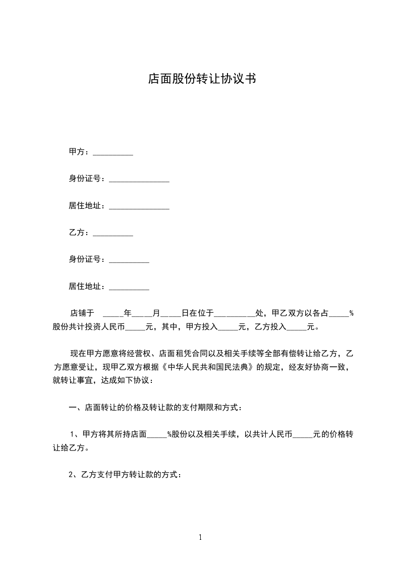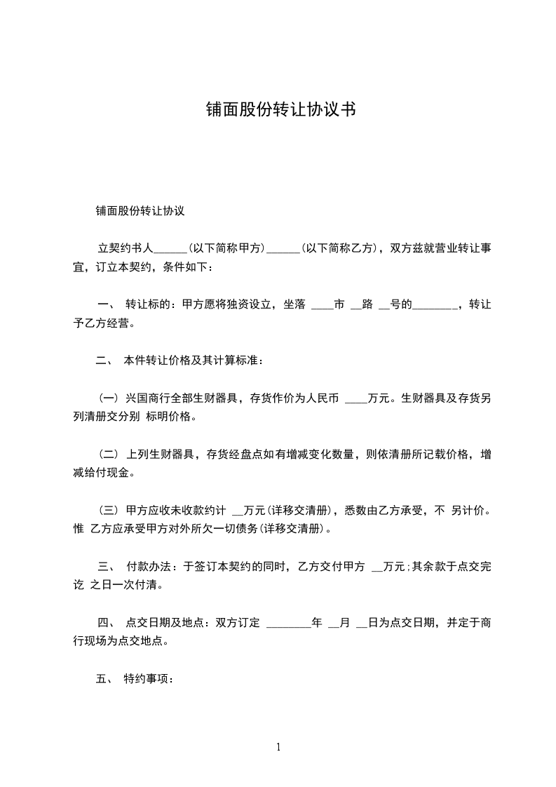 铺面股份转让协议