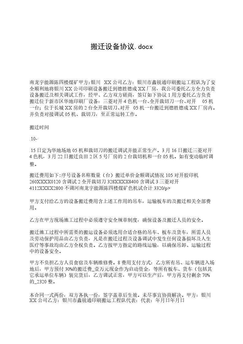 为了合理使用设备搬迁费用,安全顺利完成设备搬迁工作,经甲、乙方认真磋商,达成如下协议。