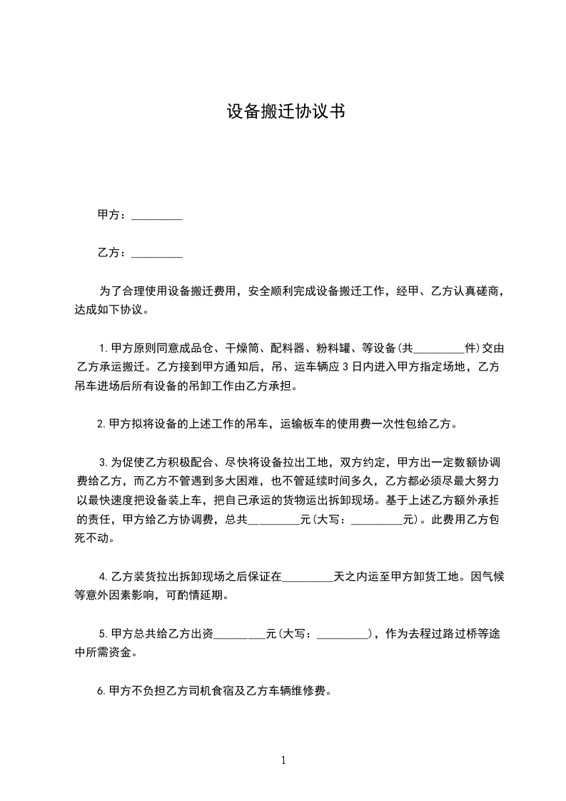 1.甲方原则同意成品仓、干燥筒、配料器、粉料罐、等设备(共_________件)交由乙方承运搬迁。乙方接到甲方通知后,吊、运车辆应3日内进入甲方指定场地,乙方吊车进场后所有设备的吊卸工作由乙方承担。