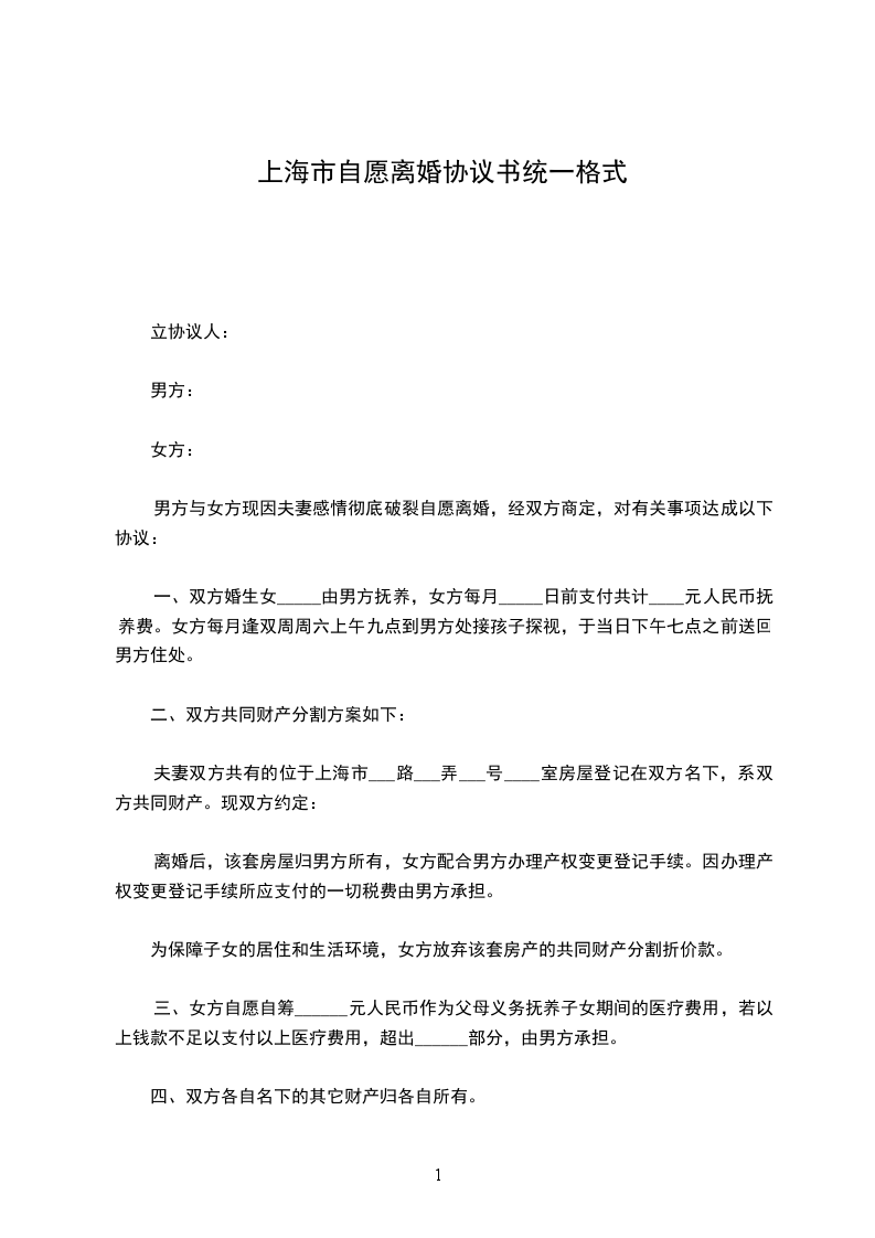 注:本协议书范本为上海地区民政局统一格式。
