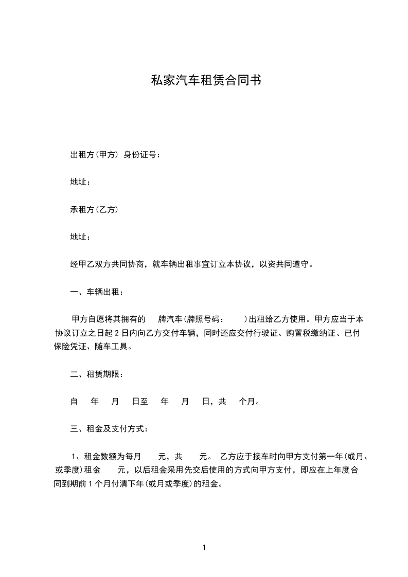 甲方自愿将其拥有的 牌汽车(牌照号码: )出租给乙方使用。甲方应当于本协议订立之日起2日内向乙方交付车辆,同时还应交付行驶证、购置税缴纳证、已付保险凭证、随车工具。