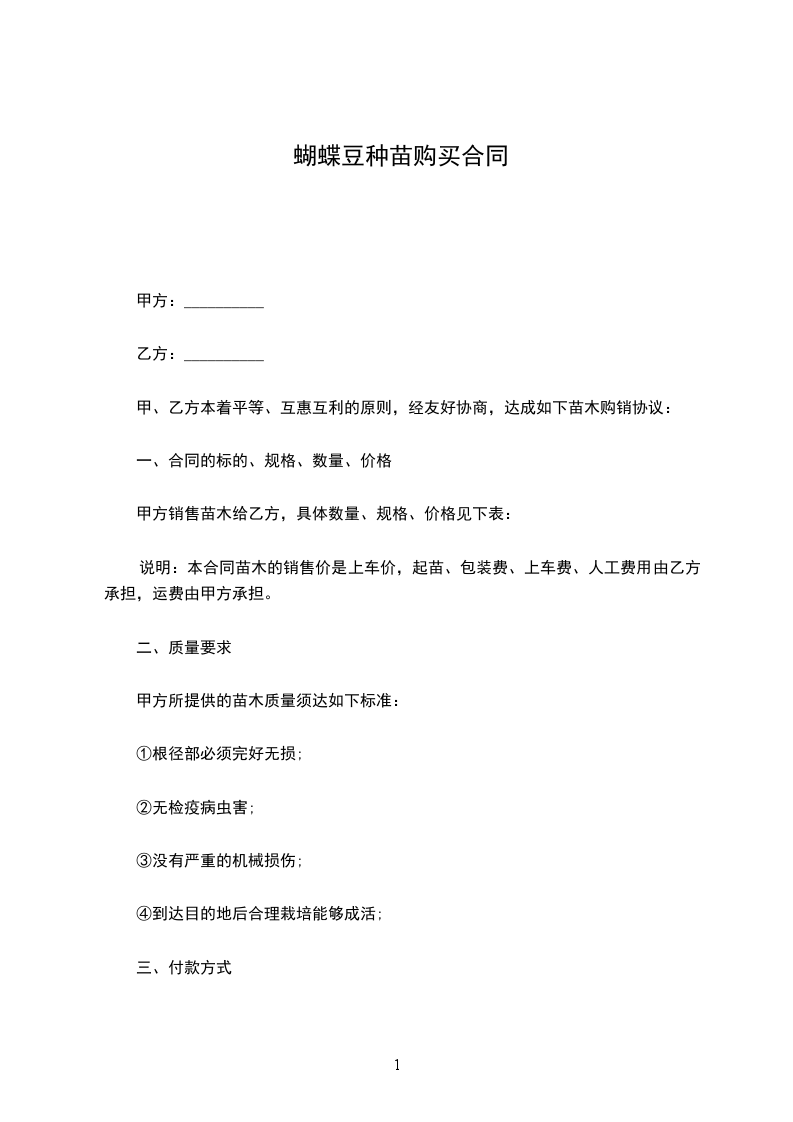 一、甲方向乙方采购苗木_____棵,金额为__________________________________________元整、甲方与乙方按实际采购苗木数量,按实结算。