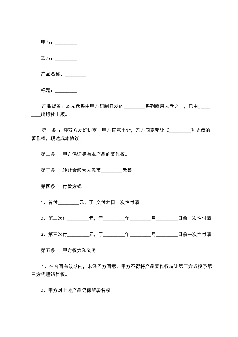 一、经双方友好协商,甲方同意出让,乙方同意受让《_________》光盘的著作权,现达成本协议。