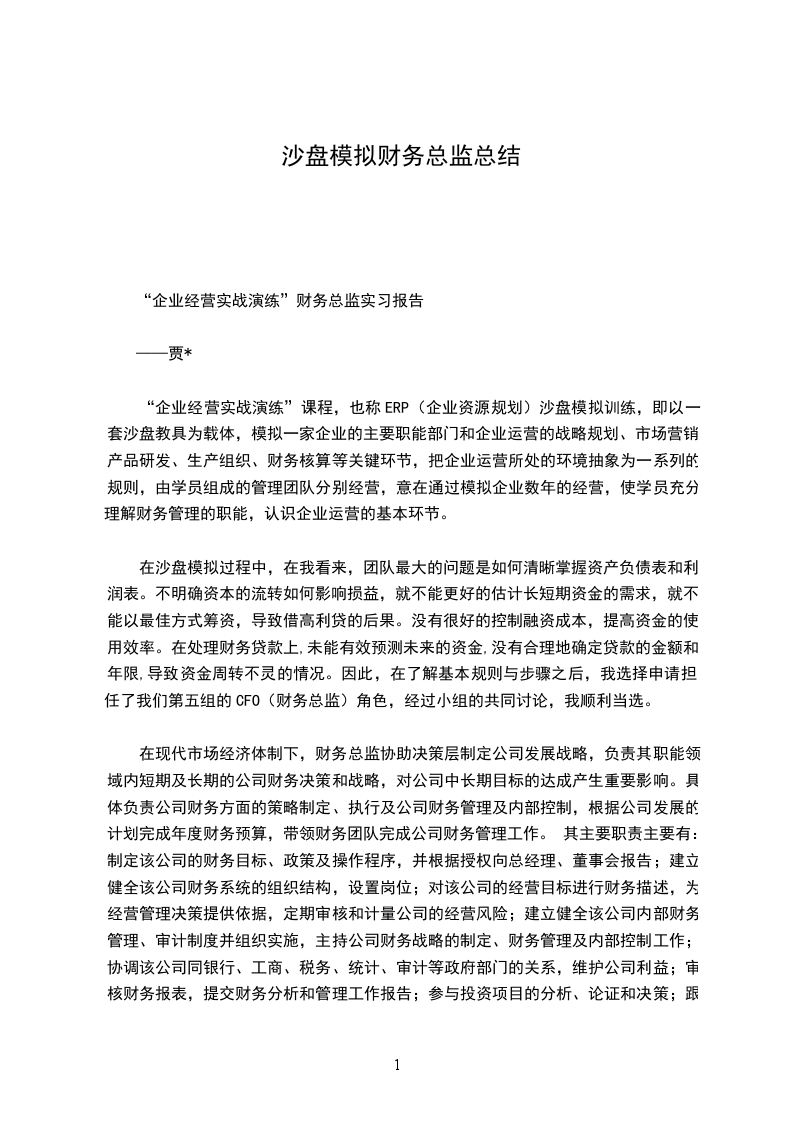 “企业经营实战演练”财务总监实习报告