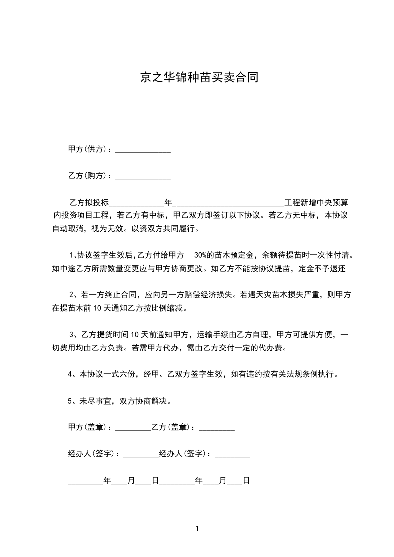 一、甲方向乙方采购苗木_______株,金额为人民币________.甲方与乙方按实际采购苗木数量,按实结算。