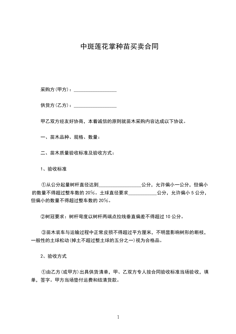 1、协议签字生效后,乙方付给甲方30%的苗木预定金,余额待提苗时一次性付清。如中途乙方所需数量变更应与甲方协商更改。如乙方不能按协议提苗,定金不予退还。