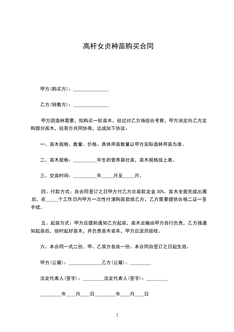 四、付款方式:自合同签订之日甲方付乙方总苗款定金30%,苗木全面完成出圃后,在_____个工作日内甲方一次性付清购苗款给乙方,乙方需要提供合格二证一签手续。