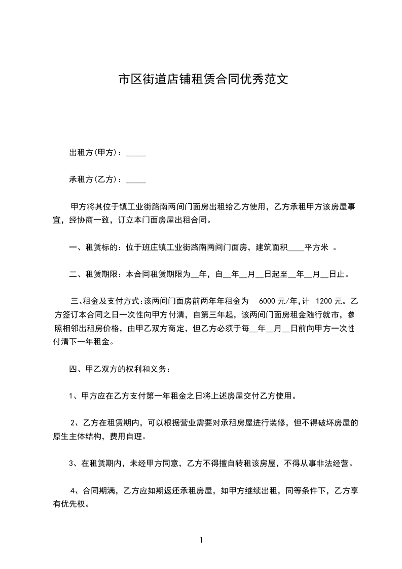 1、甲方将其合法拥有的座落于________街_______招待所以_____门面房小间出租给乙方用于经营。该门面建筑面积共_______平方米;