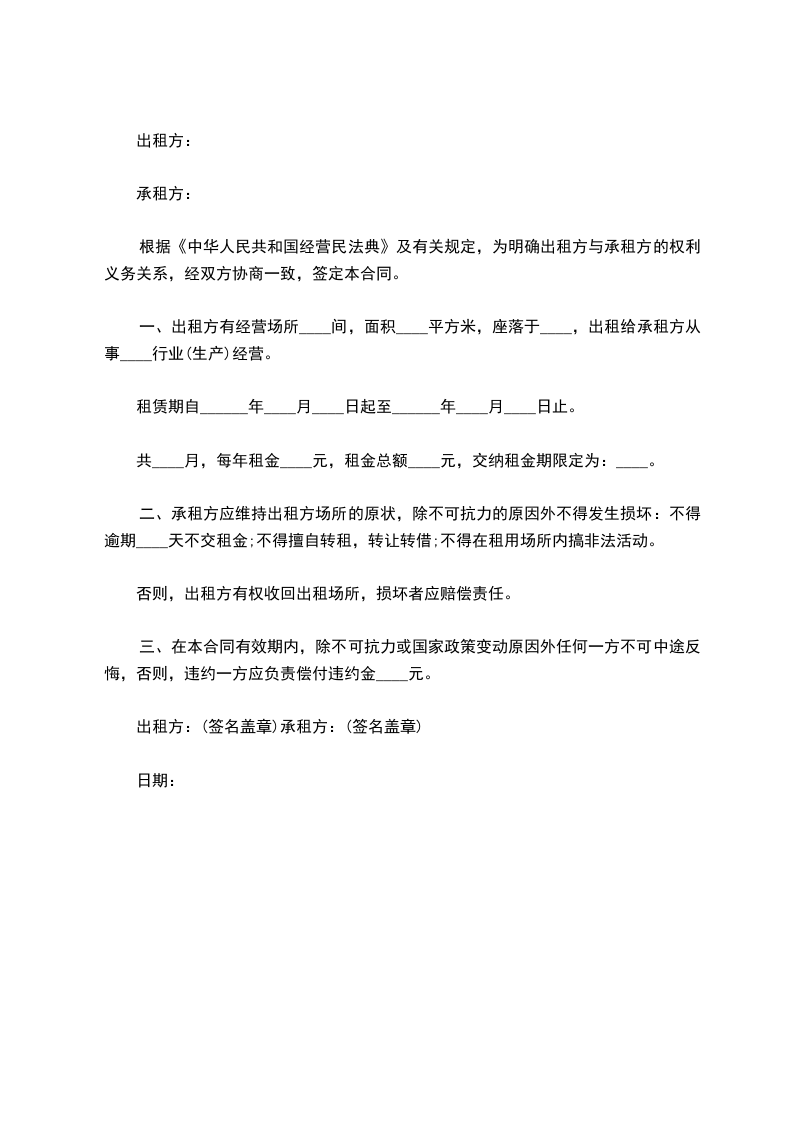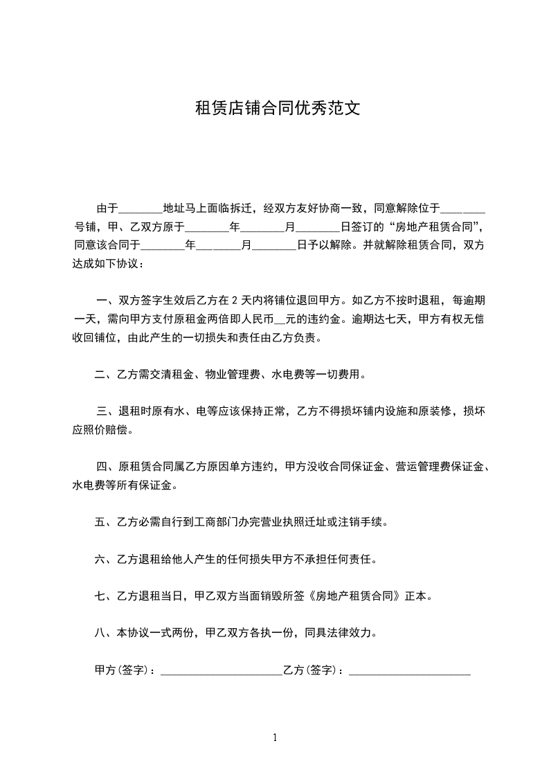 1、符合本合同第九条第1、2项的约定,非违约方有权解除合同,并有权要求违约方按当年租金的_______支付违约金,违约金不足以弥补经济损失的,还应赔偿对方的经济损失;