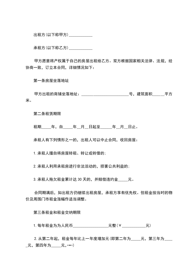 2、甲方必须保证出租给乙方的门面能够从事商业经营。不得将乙方租用的房屋转租(卖)给任何第三者;不得在租赁期内房租加价;