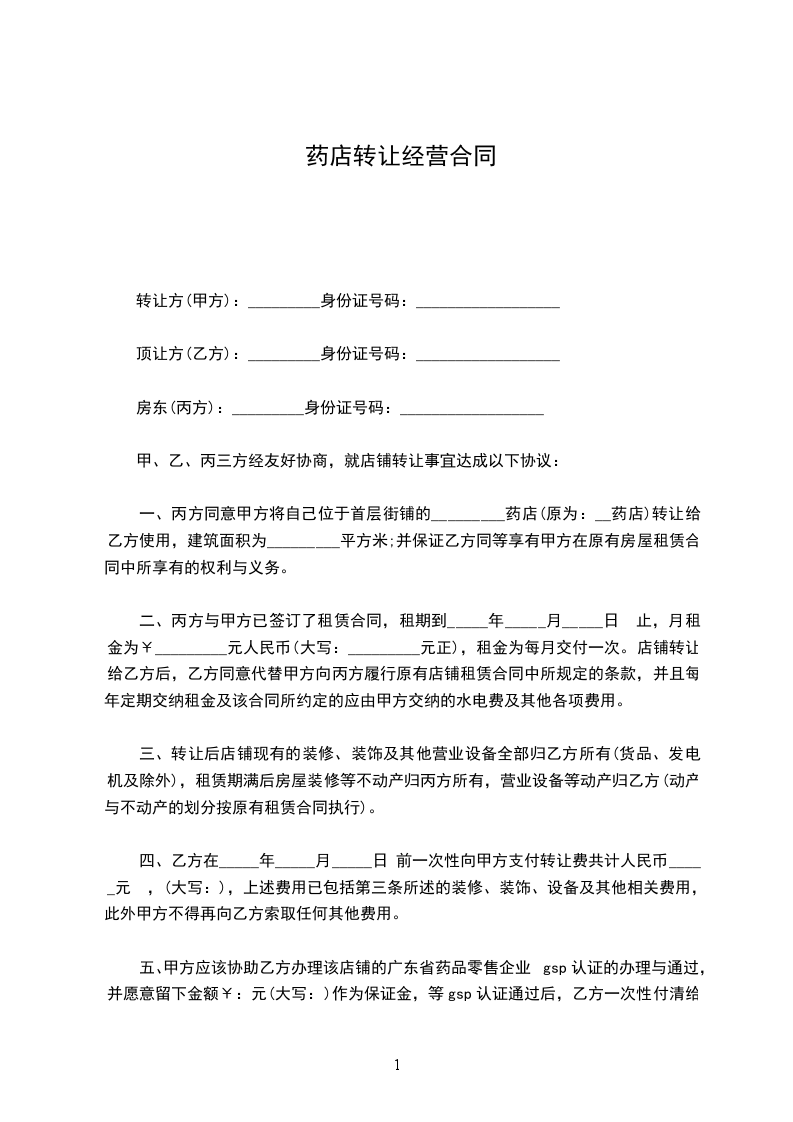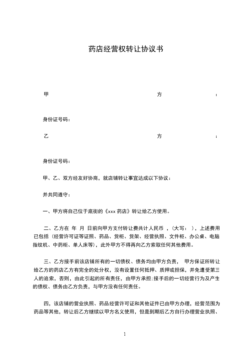 一、甲方将自己位于底街的《xxx药店》转让给乙方使用。